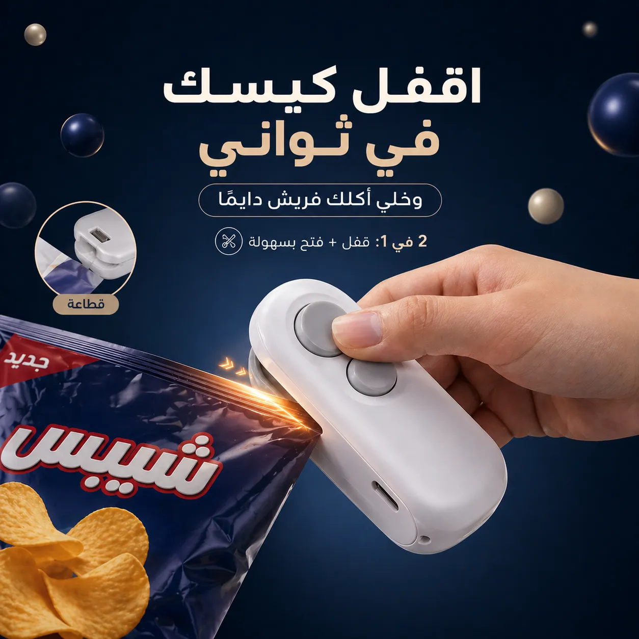 زهقت من الأكل اللي بيبوظ بعد ما تفتحه؟ ماكينة اللحام الصغيرة 2 في 1 بتقفل الأكياس وتفتحها في ثواني. قابلة للشحن بمغناطيس للتلاجة. اطلبها وحافظ على أكلك فريش!