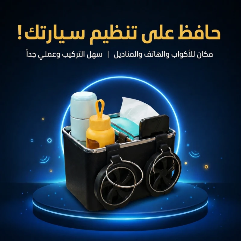 بتعاني من زحمة الكوبايات، الموبايل، والمناديل اللي مرمية في كل حتة في العربية؟ أو خايف القهوة تتدلق وتبوظ فرش الكراسي؟ المنظم الذكي ده هيحللك المشكلة ويخلي صالون عربيتك دايماً رايق ومترتب، وكل حاجة محتاجها في متناول إيدك إنت واللي راكب معاك.